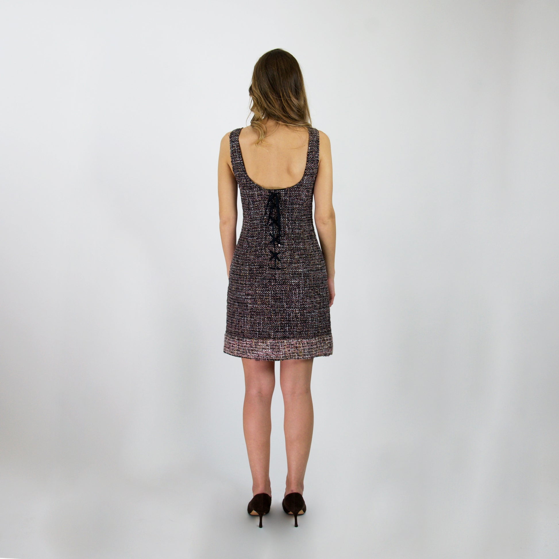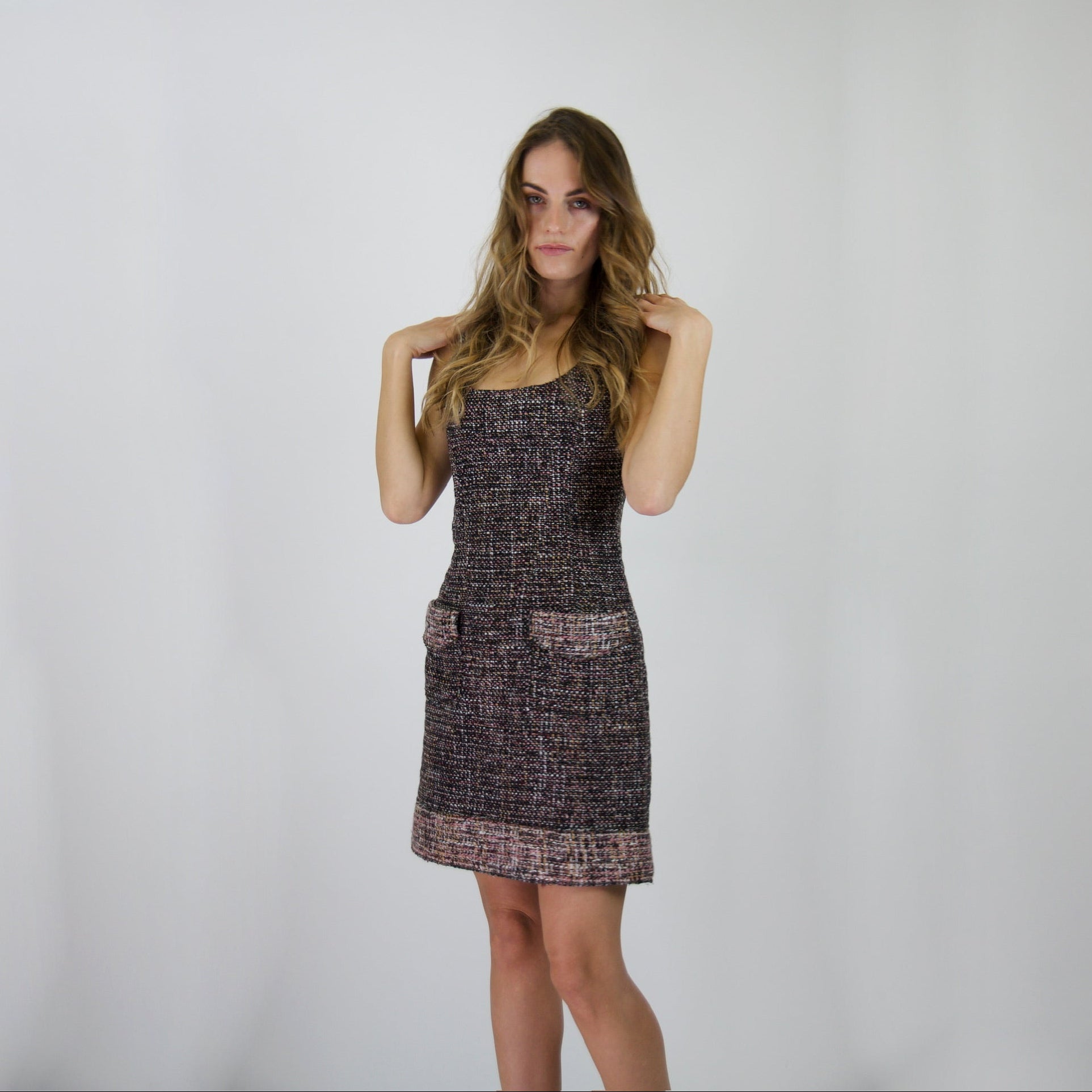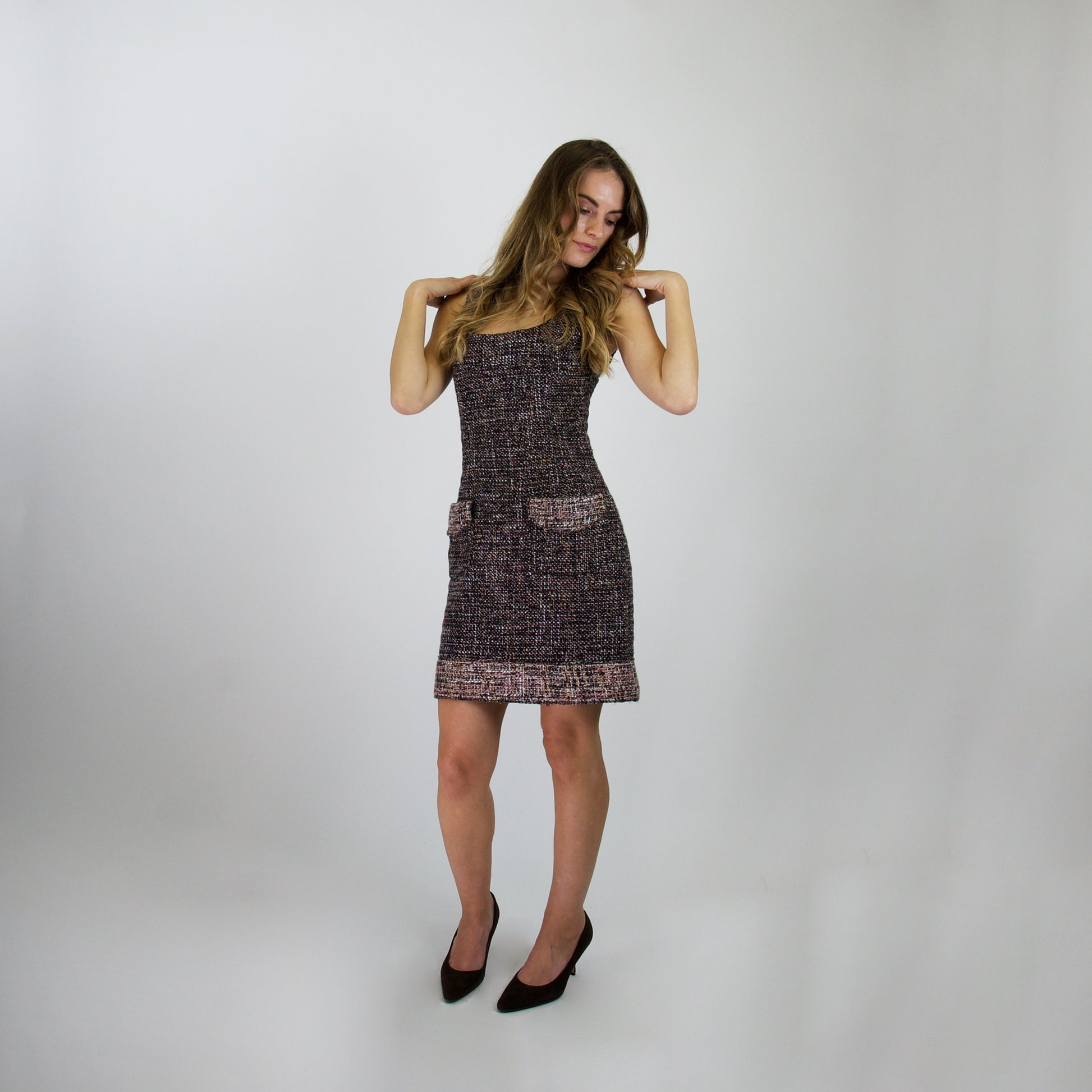 Scopri l'eleganza senza tempo con questo straordinario abito tubino Dolce & Gabbana, un capolavoro di sofisticatezza che cattura l'essenza dello stile italiano. Realizzato con un affascinante effetto bouclé, l'abito presenta una palette cromatica raffinata che spazia tra tonalità di marrone, beige e bianco su un elegante fondo nero, creando un contrasto visivo che esalta la figura. La silhouette senza maniche è perfetta per occasioni speciali, mentre le due generose tasche applicate aggiungono praticità senza compromessi estetici. Il bustier strutturato garantisce una vestibilità impeccabile e una tenuta perfetta durante tutta la giornata. Un dettaglio distintivo è il bordo più chiaro che incornicia il fondo, donando movimento e profondità al design. Ideale per chi ricerca un pezzo versatile che passa senza sforzo da un evento serale a un'occasione più formale, questo abito è un investimento nel vostro guardaroba che non passerà mai di moda.
