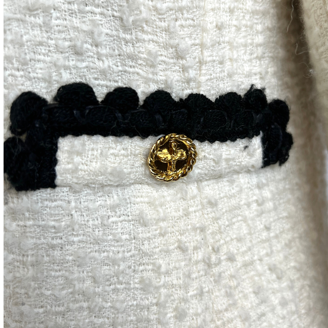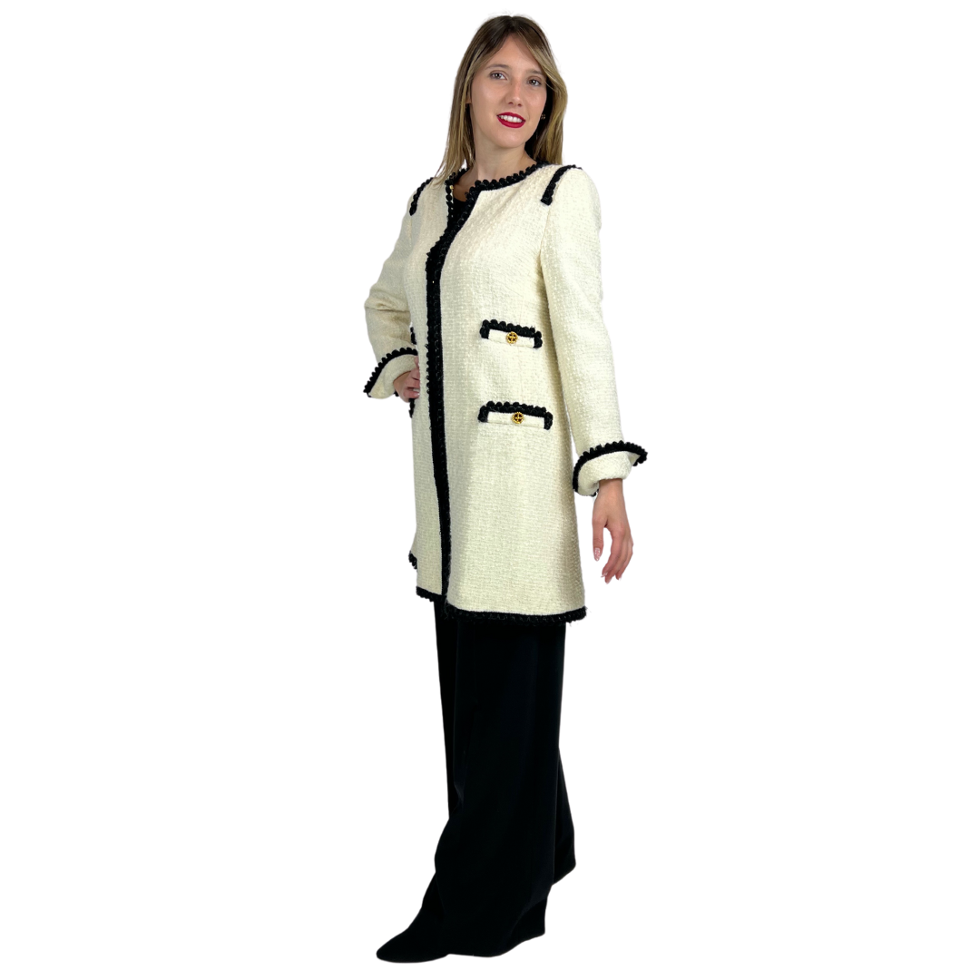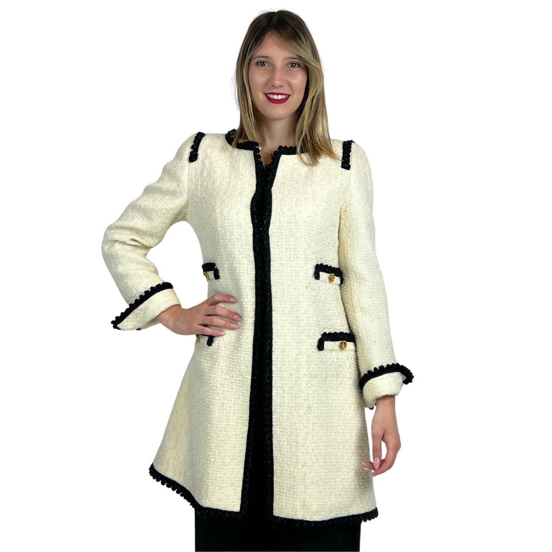 Cappotto in tessuto bouclè bianco panna con passamaneria nera e bottoni gioiello oro, leggermente imbottito