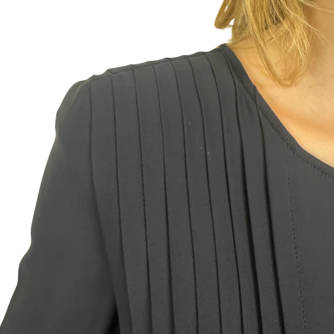 Scopri l’eleganza senza tempo con l’abito lungo in seta blu di Giorgio Armani. Caratterizzato da pieghe laterali che valorizzano la silhouette, questo modello a girocollo con maniche lunghe e polsi rifiniti è completato da una cintura cannettè italiana che definisce la vita con raffinatezza. Perfetto per occasioni speciali, unisce comfort e stile in un capo sofisticato e distintivo.