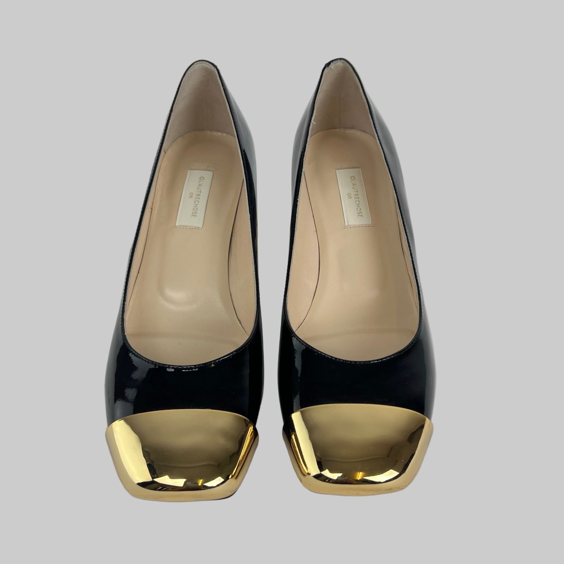 L'AUTRE CHOSE Scarpe in vernice nere con tacco e punta metallizzata oro