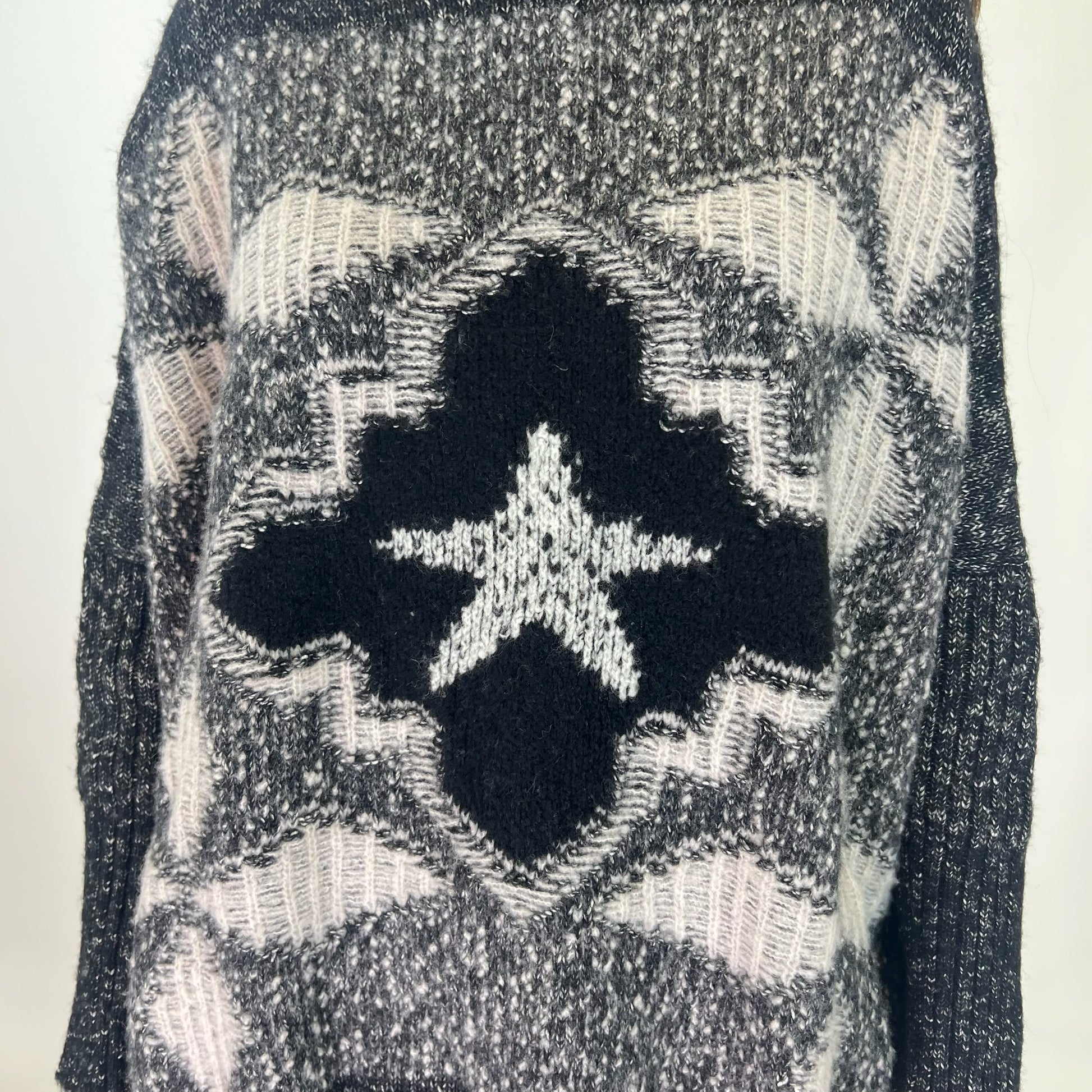 Scopri il fascino senza tempo di questo straordinario maglione oversize LORENA ANTONIAZZI, un capolavoro di eleganza contemporanea. Realizzato in pregiata lana, presenta una palette di colori sofisticati che spazia dal nero al bianco al grigio, creando un effetto screziato che cattura la luce con naturalezza. La stella centrale ricamata aggiunge un tocco di personalità e distinzione, trasformando questo capo in una dichiarazione di stile audace. La silhouette maxi avvolgente garantisce comfort assoluto senza compromessi sull'eleganza, perfetto per chi desidera un look raffinato e versatile. Indossalo con semplicità per un effetto sofisticato che valorizza la qualità artigianale del tessuto e il design ricercato.