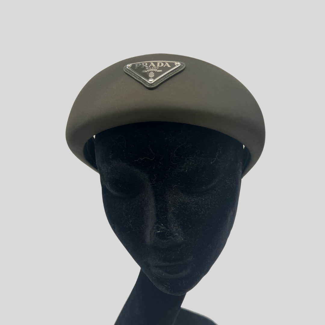 Questa fascia cerchietto rigido firmata PRADA unisce design sofisticato e materiali innovativi. Realizzata in tessuto tecnico “re-nylon” sostenibile, offre durata e leggerezza, mentre la placca metallica con logo centrale in un elegante verdone scuro dona un tocco distintivo e raffinato. Perfetta per chi cerca uno stile audace senza rinunciare alla praticità.