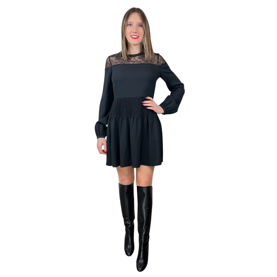 La manica lunga aggiunge un tocco di sofisticatezza, rendendo questo abito adatto a occasioni speciali e serate più formali. Gli inserti in pizzo sulla parte superiore donano un'aura di sensualità e raffinatezza, creando un contrasto elegante con il nero profondo dell'abito. Il pizzo aggiunge un tocco di trasparenza, evidenziando con grazia la pelle in modo sottile ed elegante.
